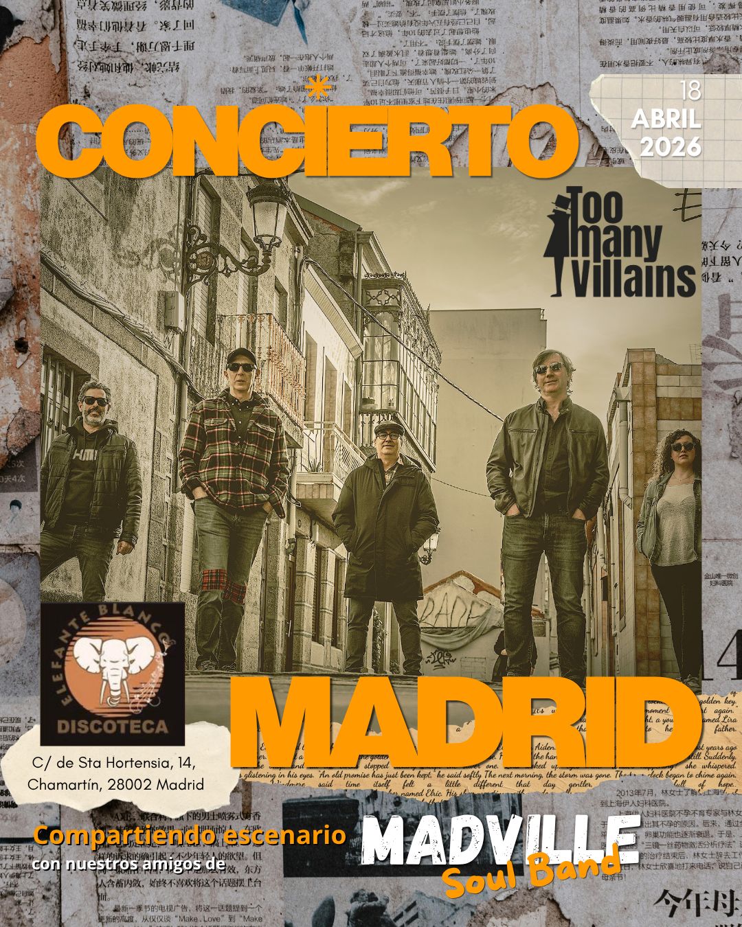 TOO MANY VILLAINS es hoy el proyecto de 5 músicos vigueses, unidos desde 2020 por su pasión para crear y desarrollar temas que contengan esencias de todo lo que nos gusta: desde el pop de los 60' al rock de los 70', pasando por el soul, el country, el funky o la música indie. De todo lo bueno se ha de aprender. Melodías atractivas, fondos de guitarras cuidadas, arreglos potentes de bajo y batería, segundas voces, coros y solos como los que apenas se escuchan ya en este siglo XXI.